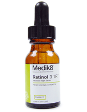 Retinol 3 TR je účinné nočné sérum, ktoré obsahuje vitamín A a vitamín E. Vďaka vysokému obsahu účinných vitamínov dokáže podporiť produkciu kolagénu a kyseliny hyalurónovej, čo vedie k zásadnej redukcii jemných vrások. Vitamín E je navyše známy ako jeden z najlepších antioxidantov súčasnosti, pomáha chrániť pokožku pred poškodením voľnými radikálmi a navyše pokožku dostatočne hydratuje. Retinol 3 TR Medik8 neobsahuje parabény a nie je parfumovaný, takže nespôsobuje alergické reakcie.